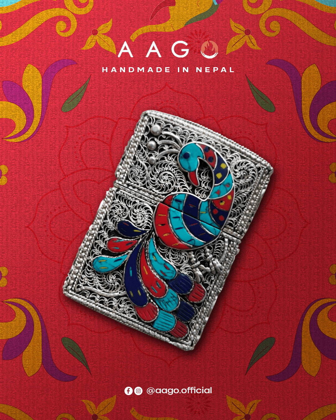 Inspired by traditional Mithila patterns, this design showcases a striking peacock inlaid on handcrafted silver filigree. A unique piece that echoes Nepal’s rich artistic legacy.